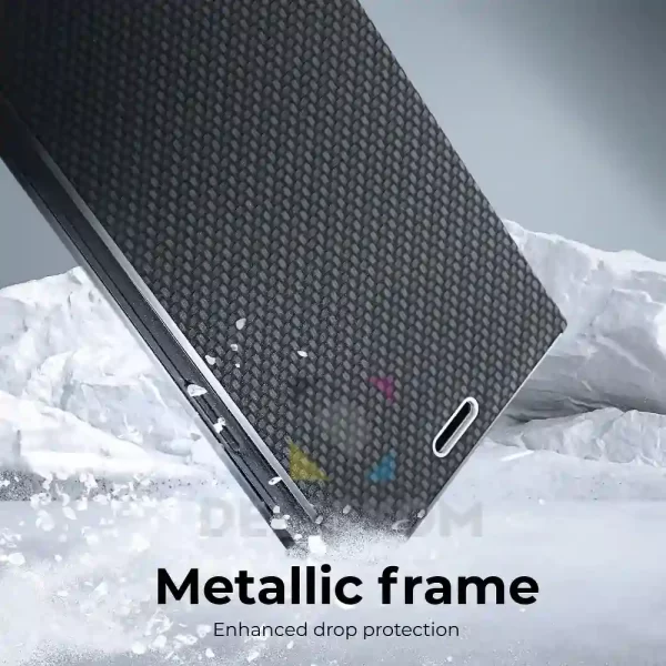 Elegantna torbica s kovinskim okvirjem za izboljšano zaščito telefona. Privlačna tekstura in na dotik prijeten material ustvarjata eleganten etui, ki poudarja sodoben dizajn naprave.