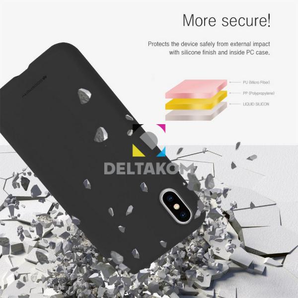Silikonski ovitek Mercury v čni barvi ščiti napravo pred poškodbami in zmanjšuje tveganje prask. Je zanimiv okras pametnega telefona.