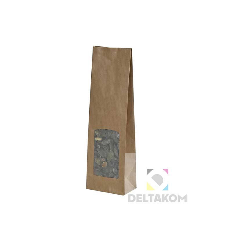 Rjava vrečka z dnom iz papirja. Papirnata vrečka z oknom je primerna za shranjevanje živil.