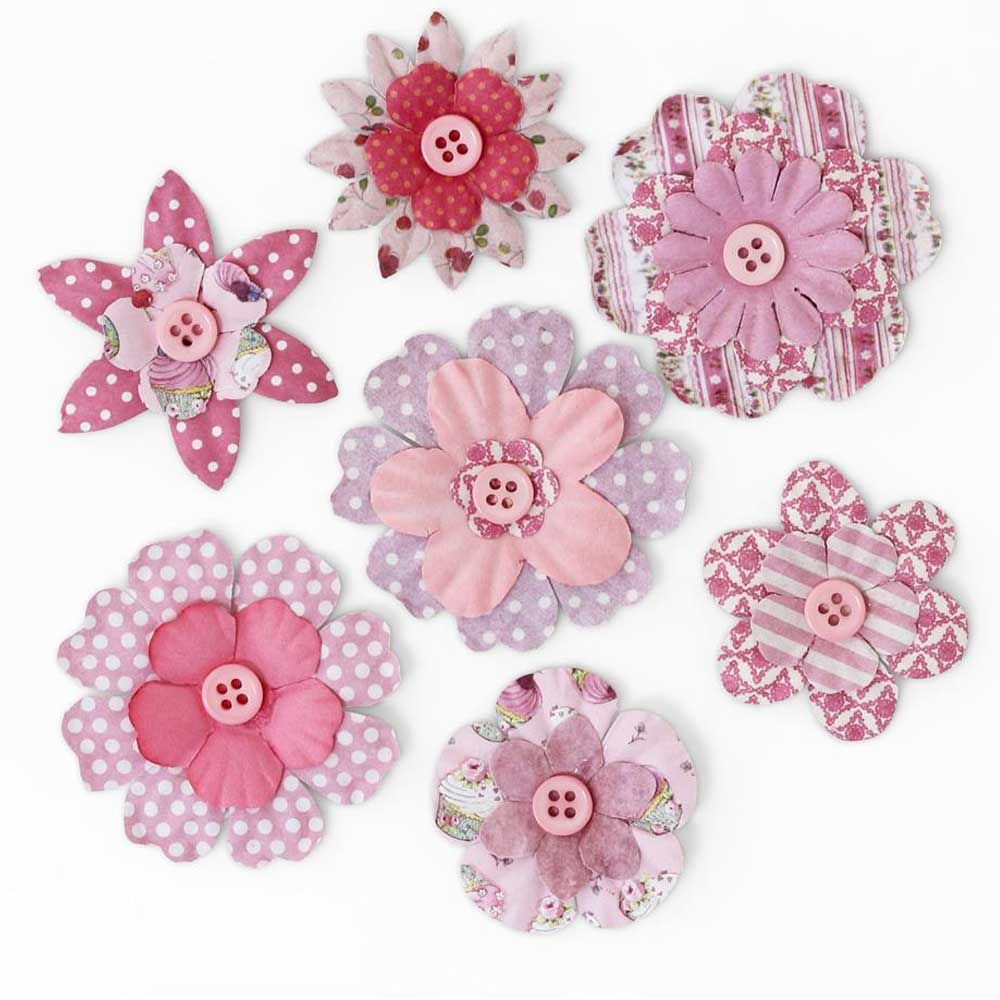 Paket vsebuje cvetje v več barvah in velikostih iz papirja.