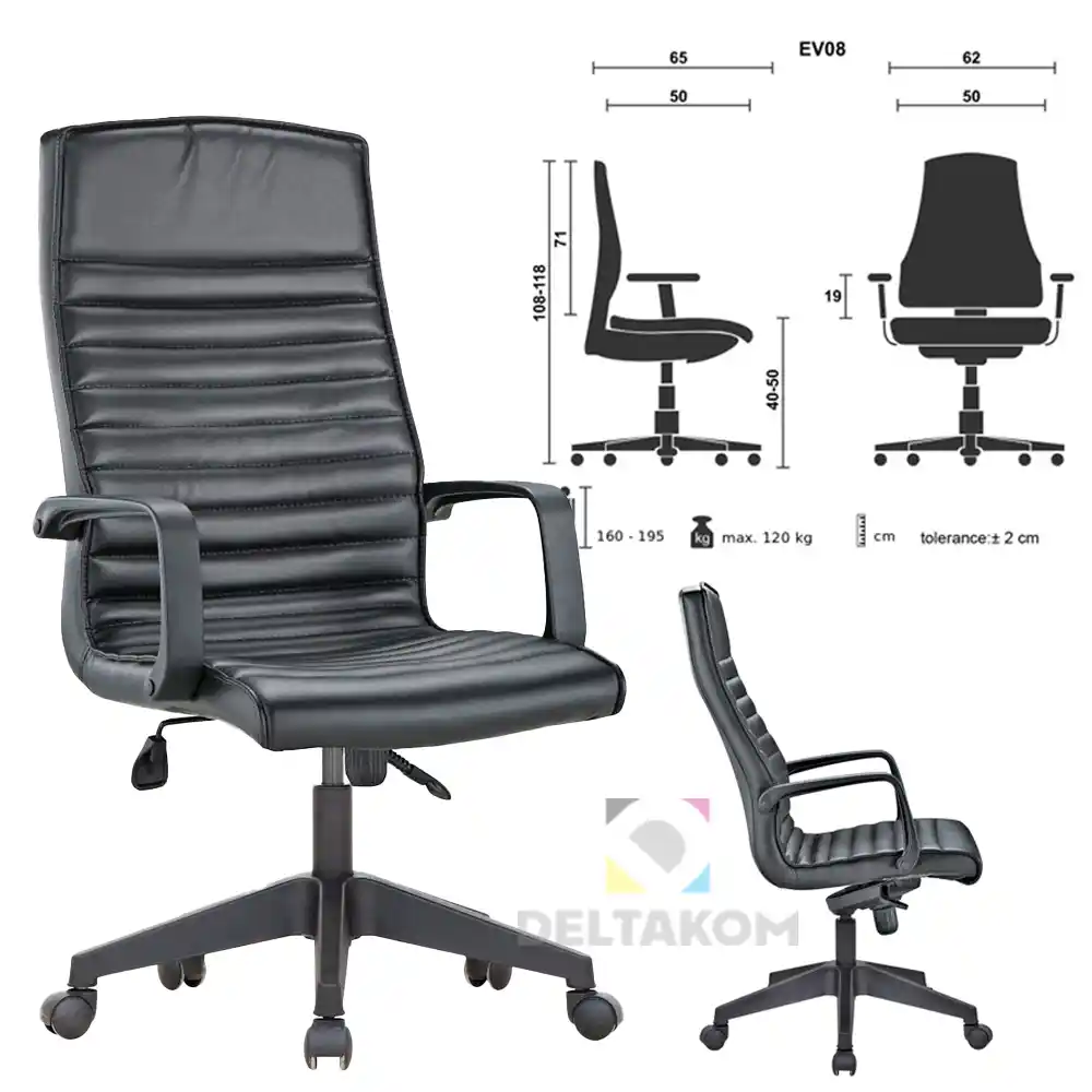 Ergonomski pisarniški stol Eva v črni barvi z Multi Tilt mehanizmom, nastavljivo višino, vzglavnikom in nosilnostjo do 120 kg. Za 7–10 ur dnevne uporabe.
