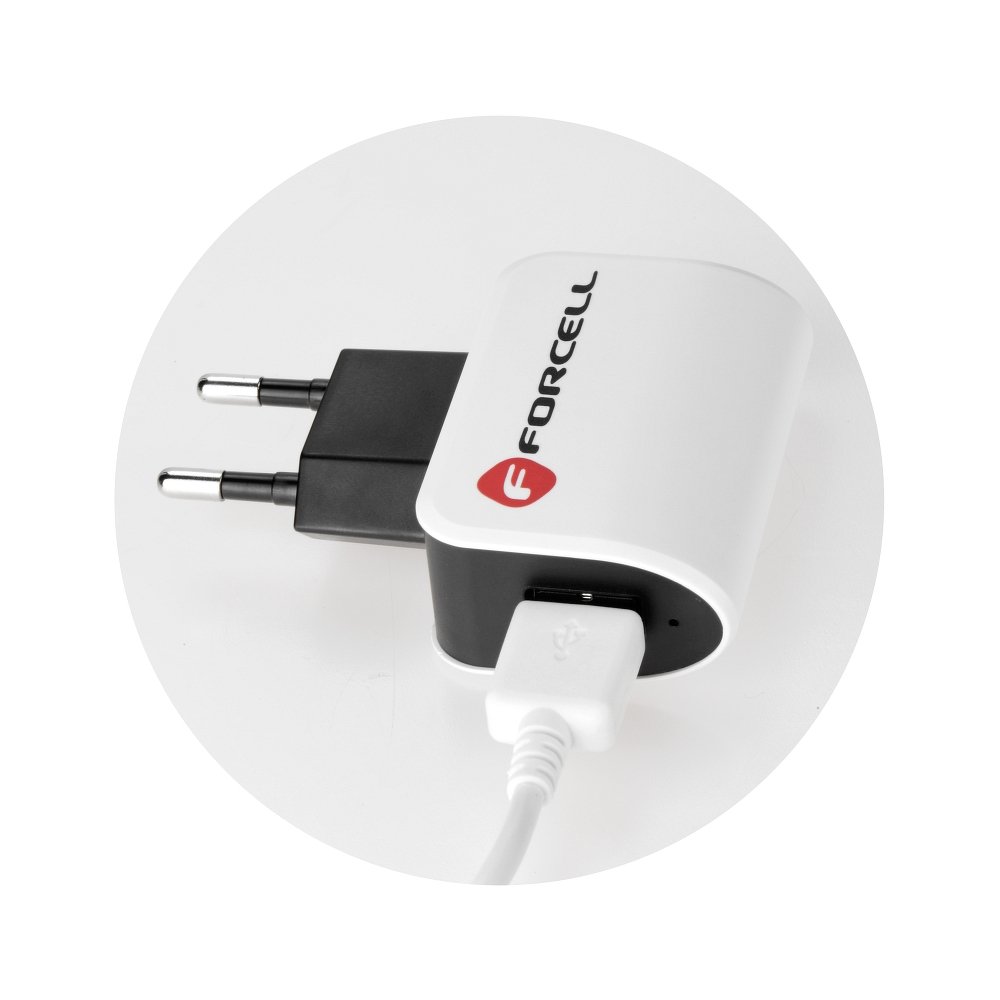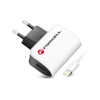 Forcell Apple 8-pin Lightning polnilec s priloženim kablom, USB-A izhod, 5V/2.4A, zaščita pred prenapetostjo in kratkim stikom.