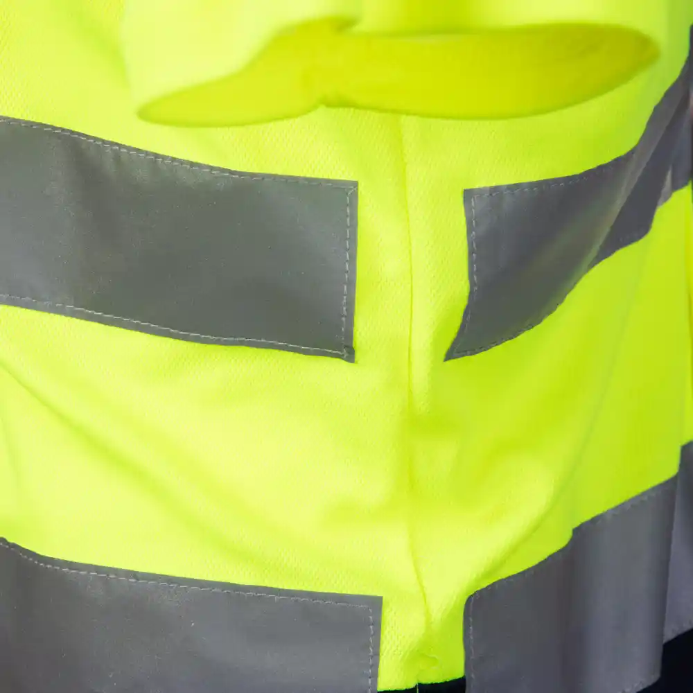 Material: 50 % poliester, 50 % bombaž. Izdelava/šivanje: barvni vstavki, zavihani ovratnik. Žepi: brez stranskih žepov, prsni žep z gumbom. Odsevni elementi: odsevni trakovi.