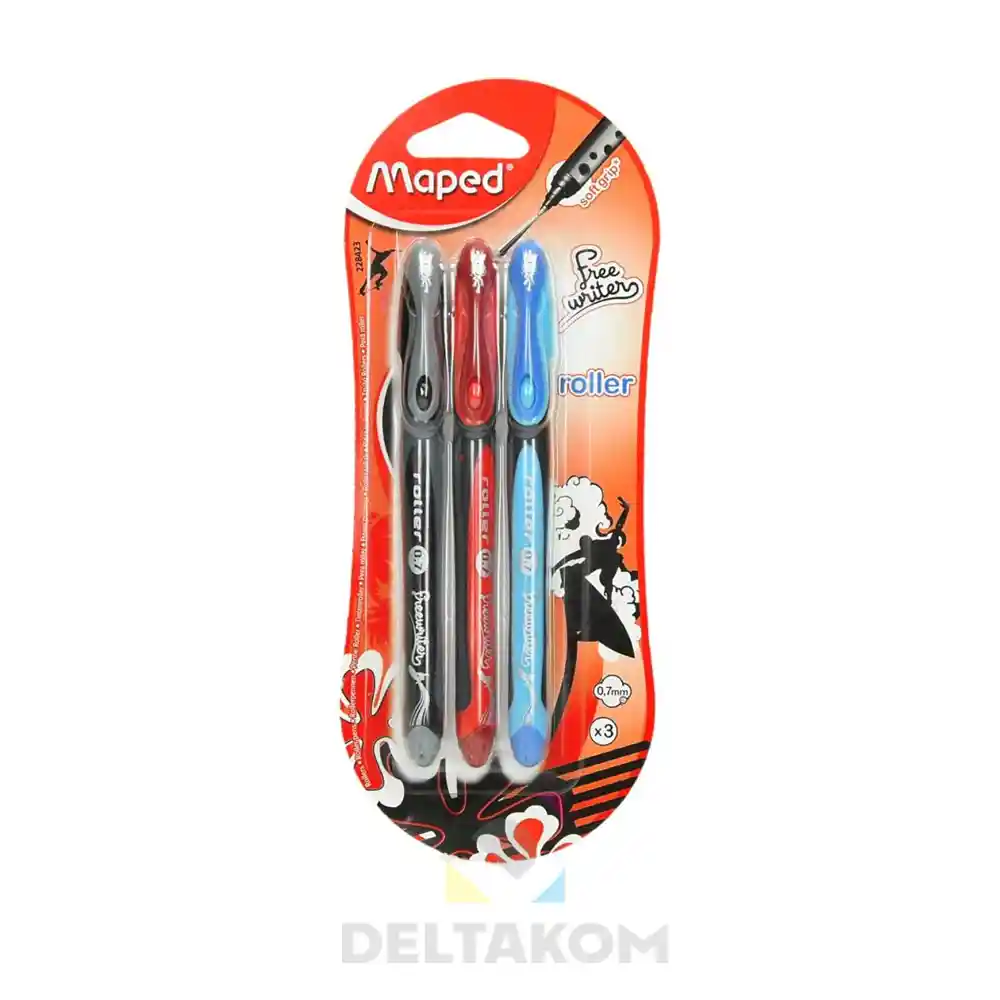 Roler MAPED Freewriter, kakovostno pisalo na voljo v treh barvah črnila. Udobno pisanje za šolo, pisarno in dom. Proizvajalec Maped, Francija.