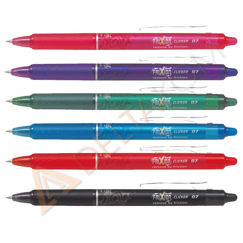 Briše čisto, s toploto, ki jo generira FriXion radirka na koncu rolerja, brez nadležnih svaljkov. Z istim pisalom pišemo po že izbrisani površini (in ne kot pri brisalcih standardnega črnila, kjer pisanje po izbrisani površini ni možno). Z uporabo patentiranega termoobčutljivega črnila, FriXion Ball Clicker, zaprisežen PILOT-ovi tradiciji, uvaja revolucijo v pisanju! Zabaven stil s konus obliko in tetoviranim ohišjem, je na voljo v 7 barvah. Ni primeren za uporabo na uradnih dokumentih, za pisanje izpitov ali na dokumentih trajnejše vrednosti.