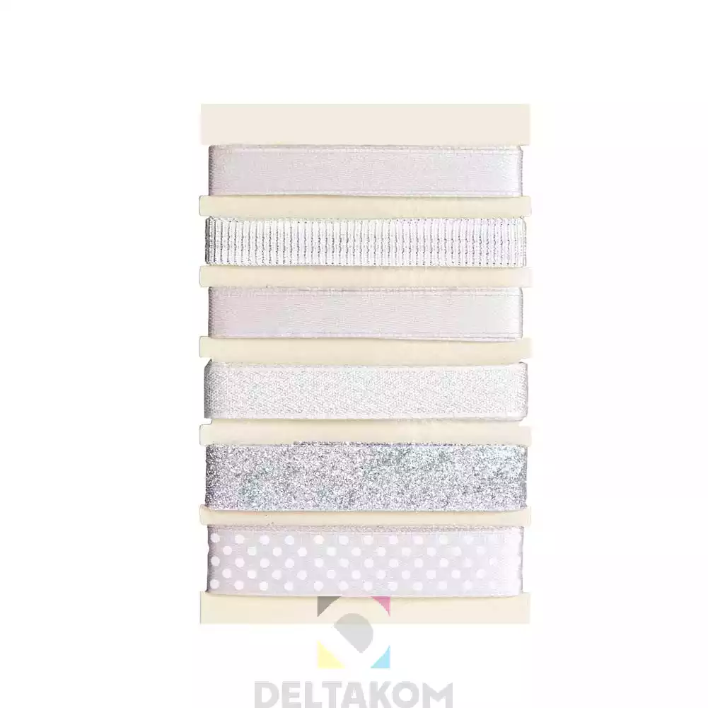 Set okrasnih trakov v srebrni barvi vključuje 6 različnih trakov dolžine 1 m, popolnih za dekoracijo voščilnic, daril in poročnih okraskov.