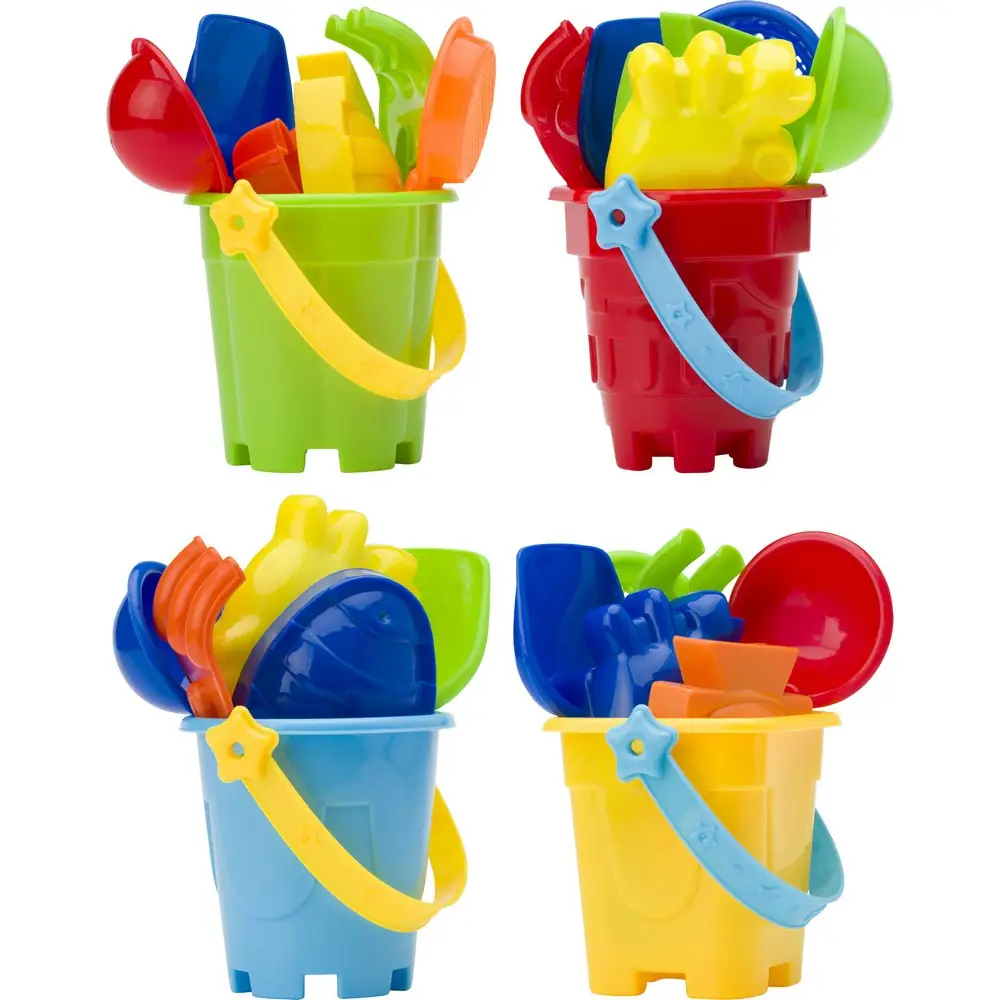 Vedro za plažo v 4 različnih barvah in oblikah – 2 okrogli, 1 kvadratna in 1 osmerokotna, znotraj: lopata, vilice, zajemalka, cedilo za pesek in 2 modela (v obliki ribe in rakovice), mešanica 4 različnih vzorcev Material: PP. Mere: PP, PP, PP, PP, PP, PP, PP, PP, PP, PP, PP: Ø9,9 x 8,9 cm.
