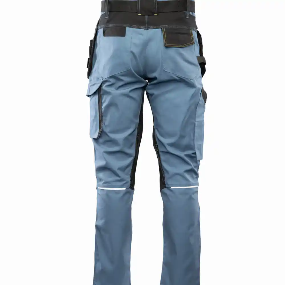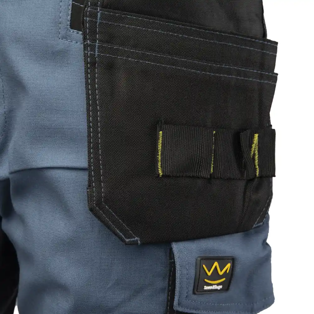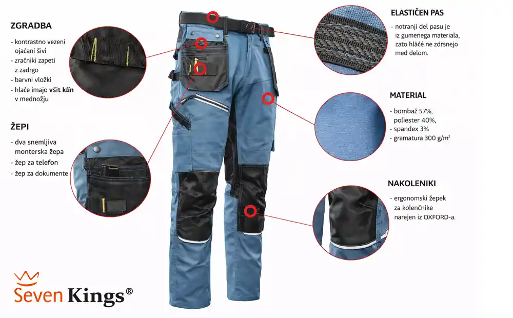Material: 57 % bombaž, 40 % poliester, 3 % elastan. Izdelava/šivanje: izdelano iz visokokakovostnega materiala, ki zagotavlja stabilnost barve in velikosti po večkratnem pranju, dvojni in trojni šivi, šivani z močno nitjo, barvni vstavki, kontrastni zaključni šivi, hlače imajo v mednožju vstavek za večjo svobodo gibanja in udobje uporabnika, zračniki, logotip SEVEN KINGS, elastični robovi, zanka za pas za kladivo, ergonomski žep za kolenske blazinice, prezračevalne odprtine, zaprte z zadrgo. Žepi: žep za merilni trak, žep za mobilni telefon, žep za dokumente, žep za pisalo, dva ojačena stranska žepa, obroč za značko, dva snemljiva žepa za monterja. Nastavitev pasu z elastičnim pasom. Odsevni elementi: odsevni dodatki.