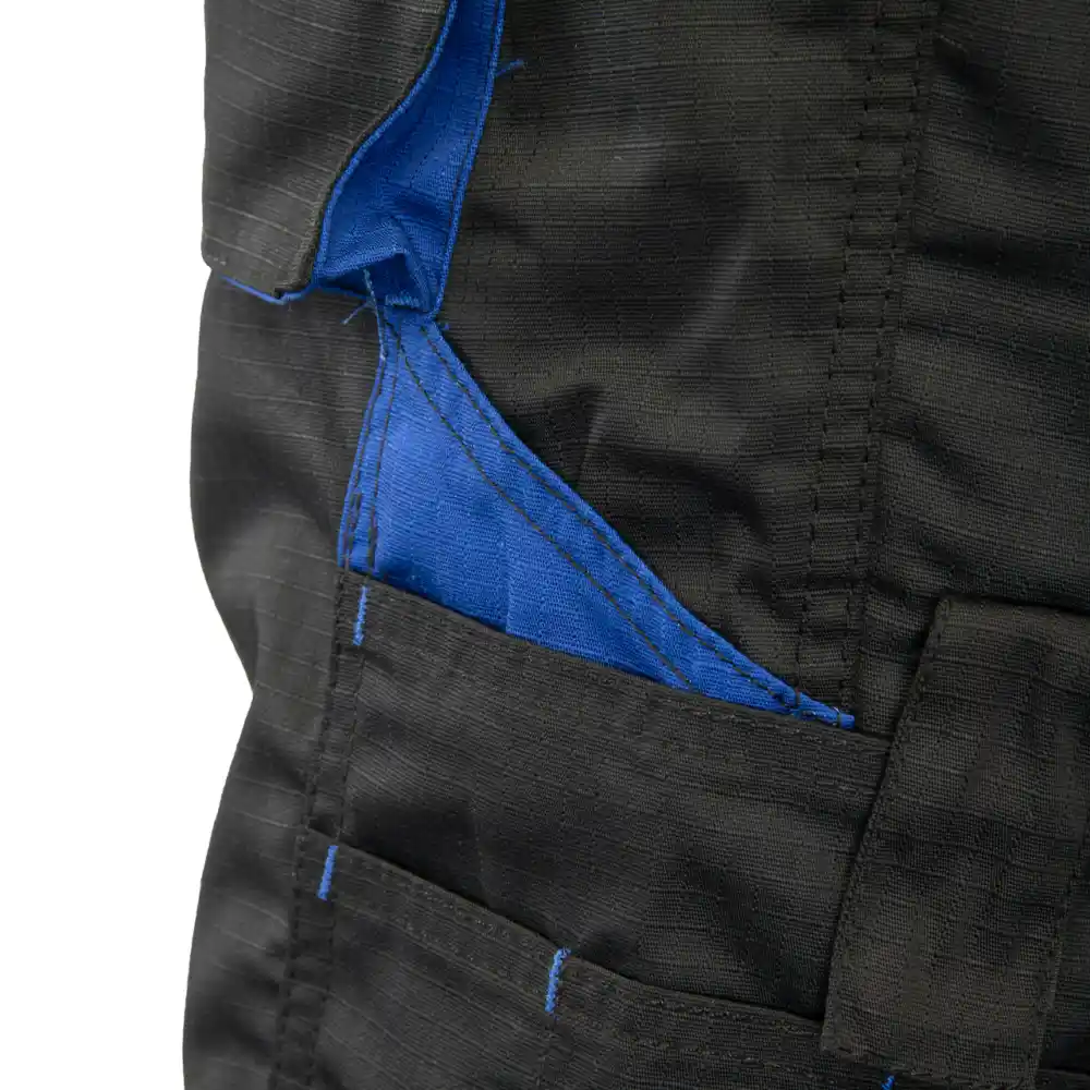 Žepi: dva žepa na zadnjem delu hlač, prostrani žepi, dva stranska žepa, žep za mobilni telefon, žep za pisalo, žep za dokumente, žep za merilni trak, ergonomski žep za kolenske blazinice. Nastavitev pasu: nastavljiv pas z gumbi in elastičnim trakom, prišit na zadnjem delu hlač.