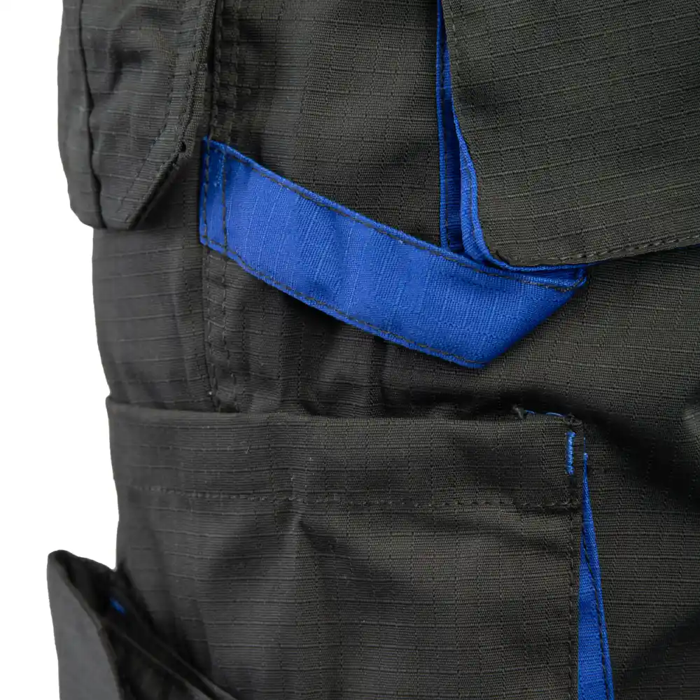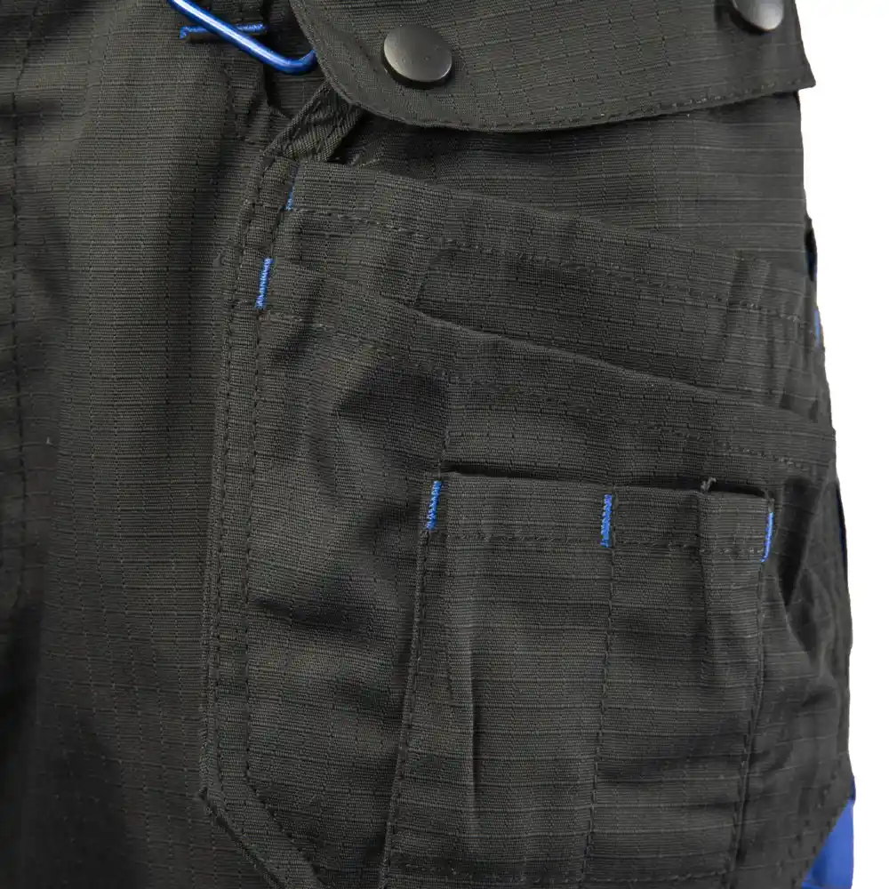 Žepi: žep za merilni trak, ojačeni žepi z velcro zapenjanjem, žep za mobilni telefon, dva žepa na zadnjem delu hlač, dva žepa za sestavljalca, zapenjanje z zadrgo. Prilagajanje pasu: prilagodljiv pas zaradi elastičnega traku.
