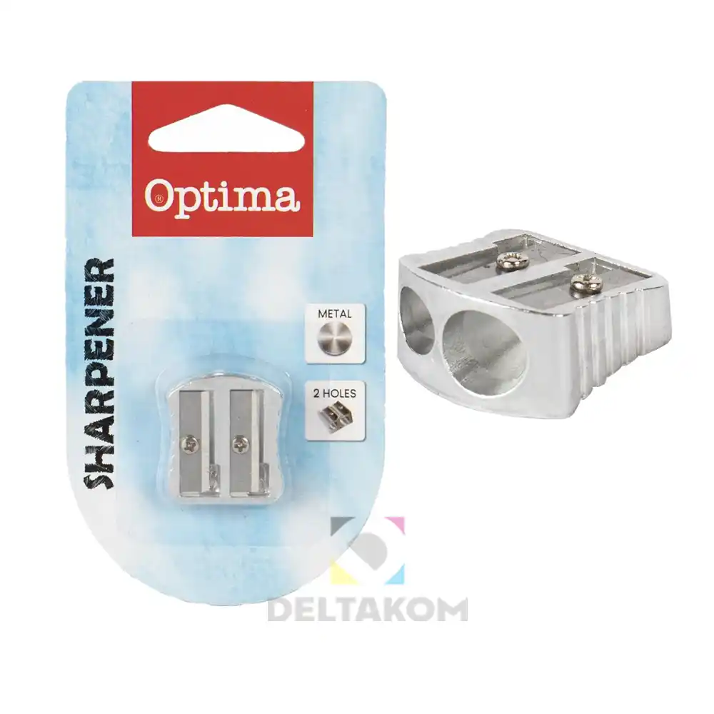 Kovinski šilček OPTIMA z dvojnim rezilom, primeren za tanke in debele svinčnike. Trpežen, natančen in pakiran v blistru – idealen za šolo in pisarno.