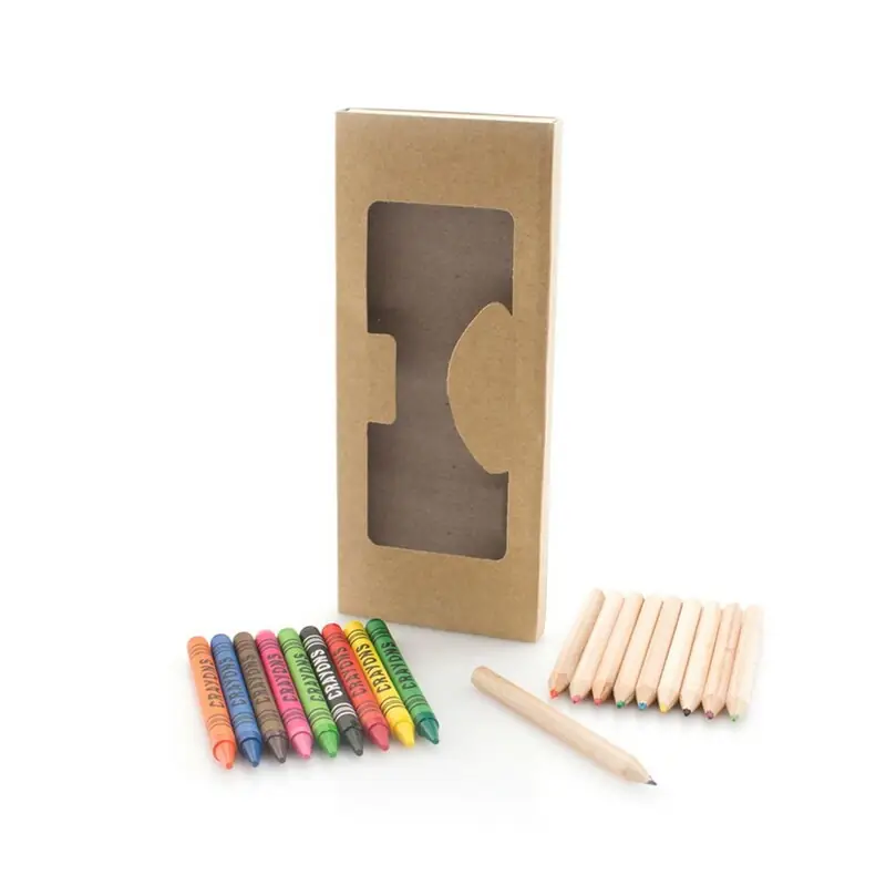Komplet 19 kosov v škatli iz naravnega kartona z okencem in notranjim pladnjem. Vsebuje voščenke in svinčnike iz naravnega lesa s šestkotnim telesom v različnih barvah. Material: recikliran karton. Dimenzije: 7,8 x 18,5 x 1,2 cm.