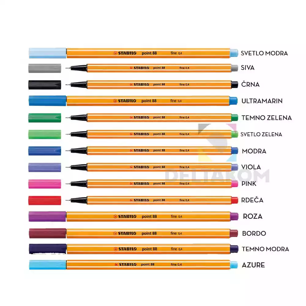 Stabilo Point 88 Fineliner 0.4 mm, z natančno konico 0,4 mm za pisanje, podčrtavanje in risanje. Dolgotrajno obstojne barve, prezračevalni pokrovček in šesterokoten dizajn za udoben oprijem.