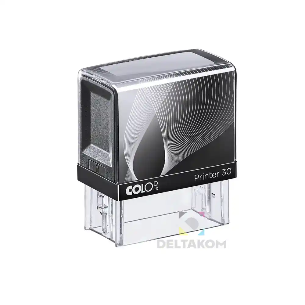Štampiljka Colop Printer 30 črno ohišje z odtisom 47 × 18 mm in do 5 vrstic besedila. Samobarvna štampiljka z vgrajeno blazinico in elegantnim črnim ohišjem.