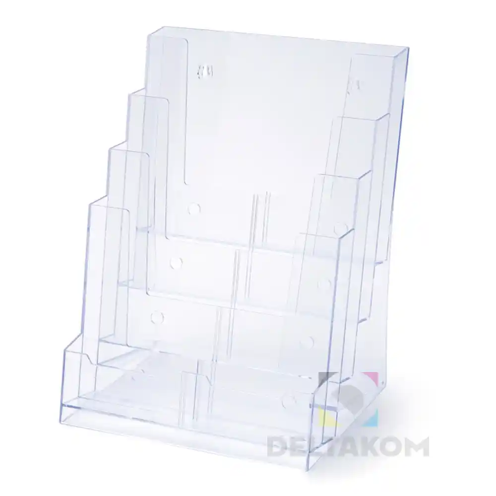 Stensko stojalo za brošure formata 4x A4. Prozorna plastika. Pokončna postavitev. Idealno za letake in zloženke.