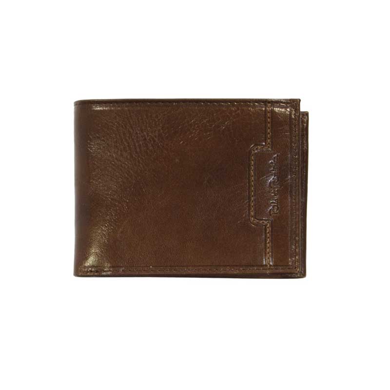 Moška usnjena denarnica v rjavi barvi z več žepi za kartice, kovance in račun, klasičen in eleganten dizajn.