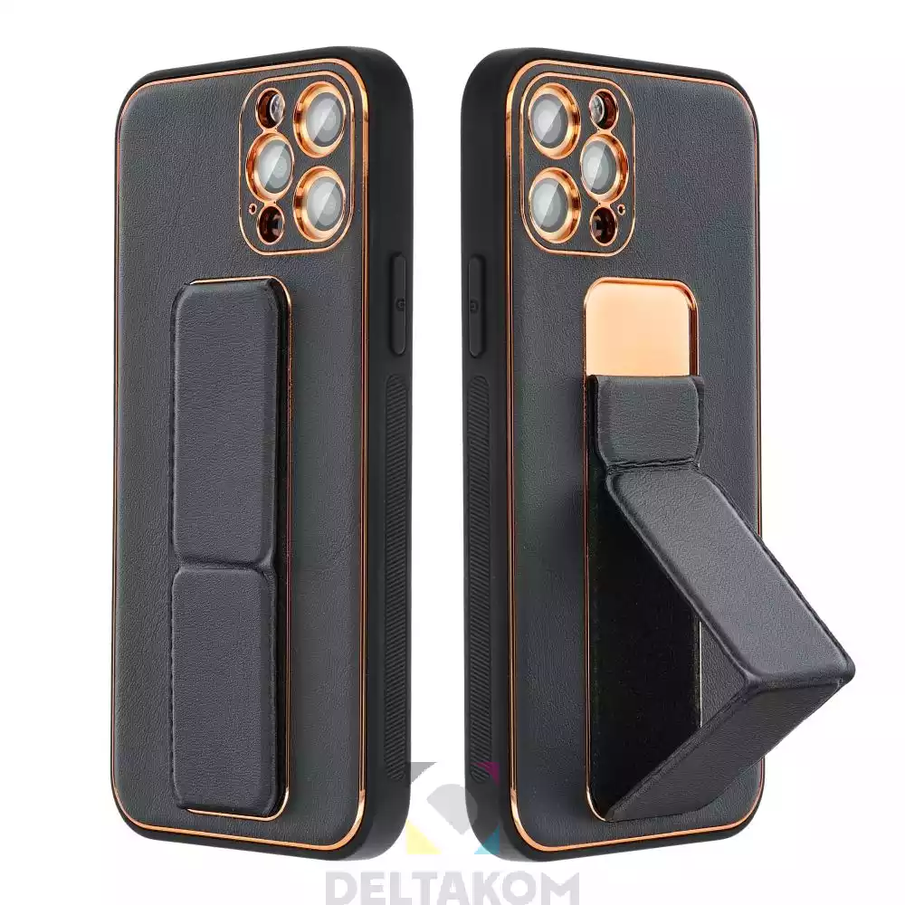 Usnjen ovitek Kickstand črn je izdelan iz kakovostnega umetnega usnja z zlatim okvirjem, ki dodaja pridih elegance. Vgrajeno stojalo omogoča prostoročno gledanje vsebin, video klice ali delo. Ovitek je združljiv z magnetnimi avtomobilskimi držali in nudi popolno prileganje telefonu.