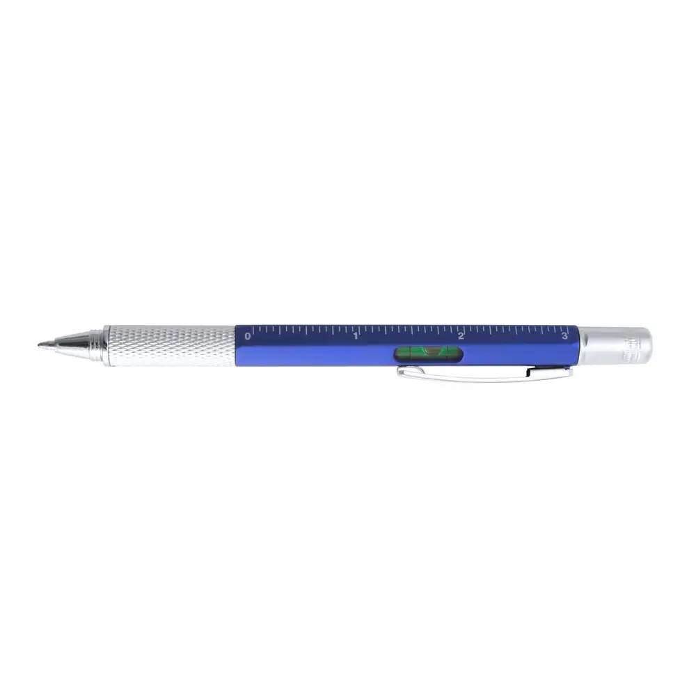 Večnamensko pisalo 4 v 1 z mehanizmom za zasuk, v različnih barvah in z mehkim ročajem. Z vgrajeno ravnilo v ohišju, ravnilom z metričnim sistemom v centimetrih/palcih in dvoglavim izvijačem – ploščatim in zvezdastim. S kovinsko sponko in modrim črnilom. Material: ABS. Dimenzije: Ø1 x 14,9 cm.