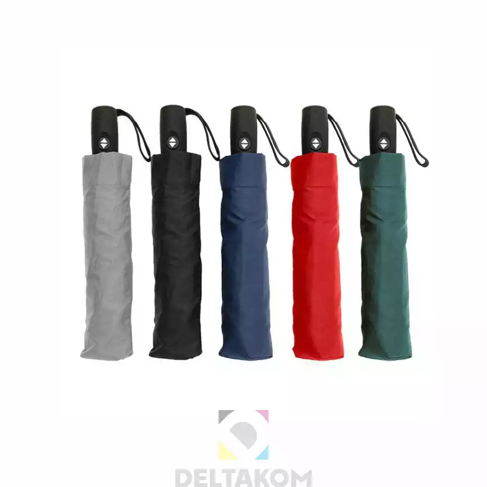 Trosekcijski zložljiv dežnik Zodiac Lux z automatskim odpiranjem in zapiranjem v pongee materialu, gumiran ročaj v črni barvi, fiberglas mehanizem in protivetrne konice.